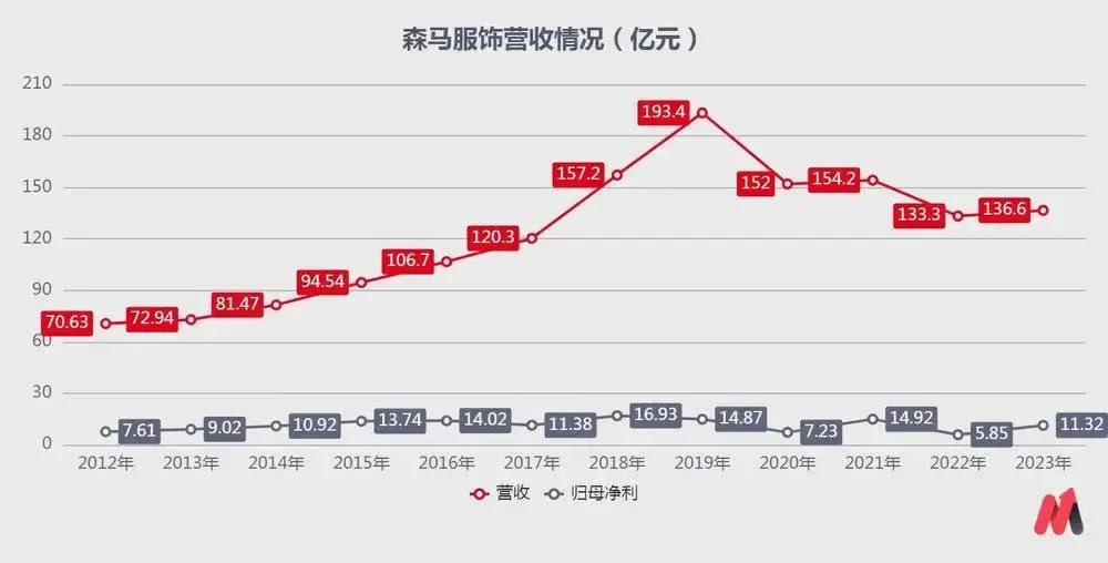 2006-2012年期間,中國服裝行業處于黃金期,總體增速超過20%,森馬借勢快速擴張,2012年線下門店約4400家,營收穩定在70億。