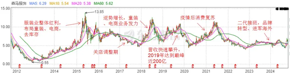 落到森馬服飾的股價走勢圖上:2014年到2015年、2020年到2021年的兩次上漲更多是行業紅利或復蘇預期帶來的整體β;2018年和2019年兩次上漲則主要源于自身產品和渠道變革帶來的增長α。