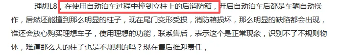 車主們反映的問題有:泊車時未識別,發生事故;泊車功能不可用;自動泊車失靈;功能缺陷等。涉及車型有L6、L7、L8、L9。