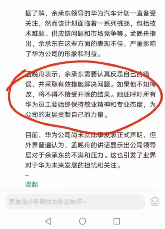 這邊廂,余承東的話音剛落,華為的“不造車派”又有高人出來接招,你方唱罷我登場,隨后網上就流傳出了華為長公主孟晚舟的如下言論: