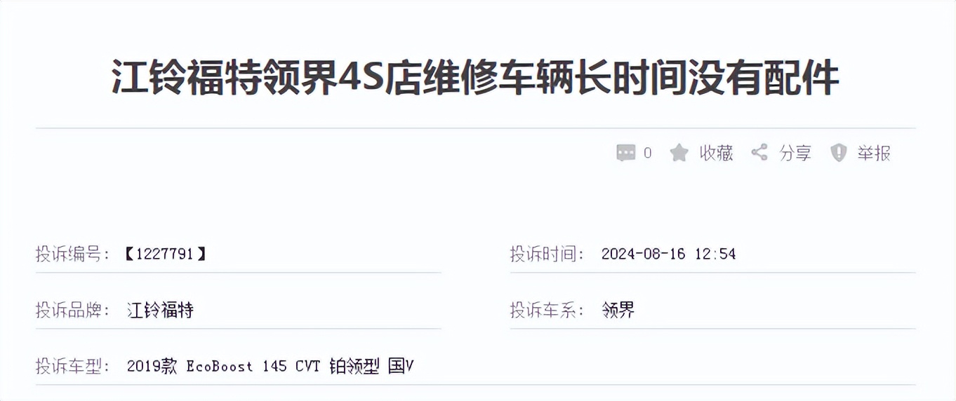 媒體調查發現,吳女士遭遇的配件短缺問題并非個例。在一些汽車投訴平臺及車主社區,均有江鈴福特車主反映車輛維修時面臨配件等待時間長、庫存不足的情況。