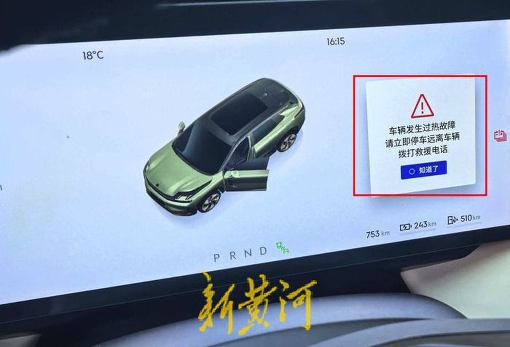 新黃河記者獲取的一張照片顯示,車輛在燃燒前,提示發生過熱故障,并要求車主立即停車撥打救援電話。從儀表盤的信息來看,該車應為245km超長續航版,報警時幾乎處于滿電狀態。