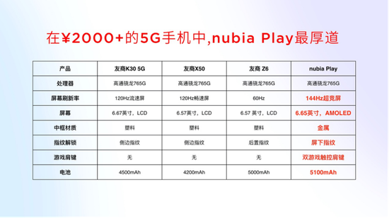 高刷新率屏幕作為近兩年手機行業軍備競賽的重要賽道,是用戶與手機交互的第一窗口亦是努比亞的優勢領域:行業首款配備90Hz高刷新率屏幕產品的紅魔3,全球唯一搭載144Hz超高刷新率的紅魔5G都是手機屏幕行業史的里程碑。此次努比亞Play 5G手機在功能上對同級別產品的降維打擊延續至屏幕,搭載了廣受用戶好評的144Hz刷新率AMOLED超競屏!此外還有同類產品都不具備的雙觸控游戲肩鍵,為用戶提供暢快淋漓的游戲體驗。