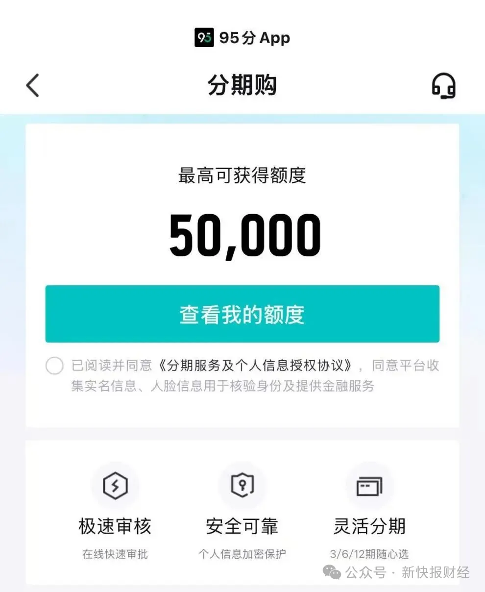 從使用場來看,當用戶在95分APP上購買商品并付款時,可選擇通過分期購進行商品款項支付。值得關注的是,分期購頁面未明顯披露年化利率區間,只在產品下方標注“極速審核”“安全可靠”“靈活分期”。該行為涉嫌侵害金融消費者合法權益。