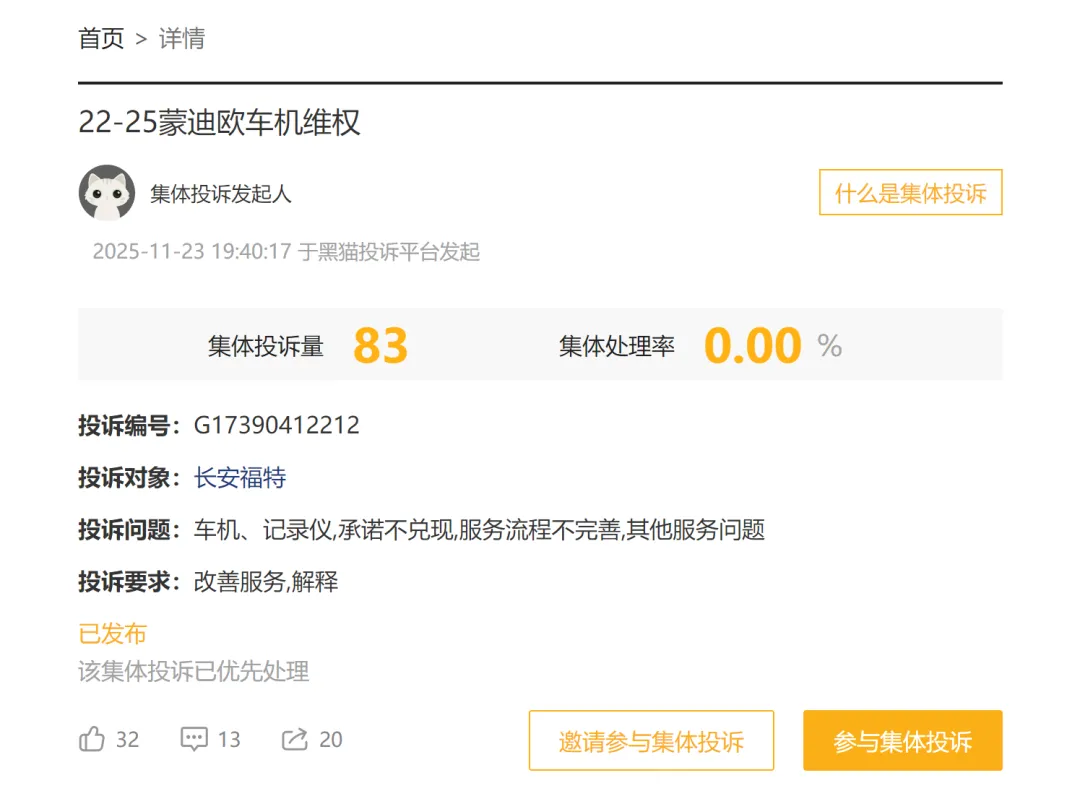 截至11月25日晚,共有83位長安福特蒙迪歐車主集體投訴長安福特汽車,車機(jī)、記錄儀,承諾不兌現(xiàn),服務(wù)流程不完善等問題。