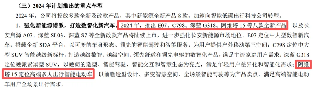 早前,長安汽車曾在2023年年報中表示,2024年將推出包括深藍G318、阿維塔15等在內的8款全新產品。其中,阿維塔15定位高端多人出行智能電動車。但截至目前,阿維塔15并未順利推出(注:疑似為阿維塔07,內部代號E15)。