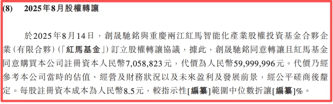 以2025年8月為例,創晟馳銘向重慶兩江紅馬智能化產業股權投資基金合伙企業(有限合伙)(「紅馬基金」)轉讓所持阿維塔的部分股權(注冊資本人民幣7,058,823元),作價約為6000萬元。