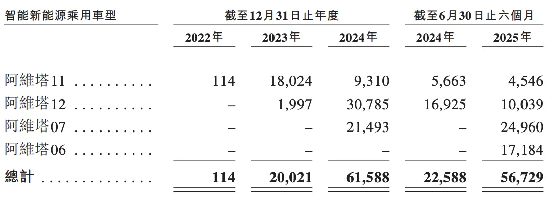 2022年12月,阿維塔開始交付車輛。招股書顯示,該公司的車輛交付量由2023年的20021輛大幅增加至2024年的61588輛。2025年上半年,阿維塔的總交付量為56729輛。其中,2025年6月的交付量為12805輛。
