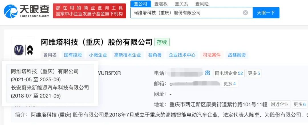 事實上,這個品牌指的就是阿維塔(AVATR),于2021年5月定名。與之對應的是,天眼查APP信息顯示,長安蔚來新能源汽車科技有限公司于2021年5月更名為阿維塔科技(重慶)有限公司(即“阿維塔”),直至2025年9月改至為股份有限公司。