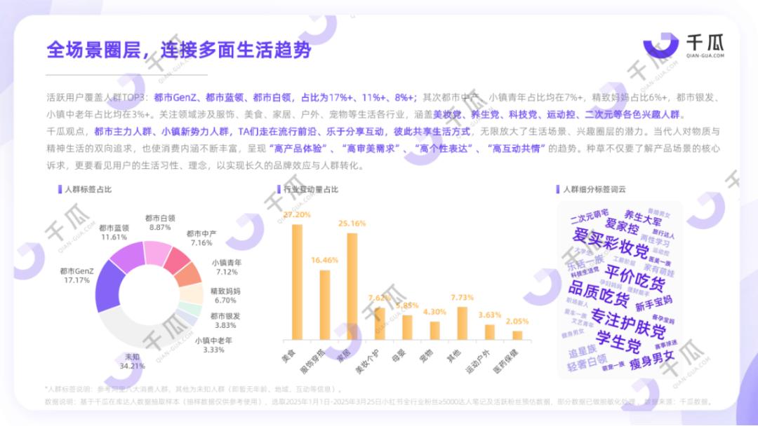 根據千瓜數據,小紅書用戶以年輕女性群體為主,集中18-34歲,主要分布在一二線城市,追求時尚、美好生活,消費意愿和能力較強。