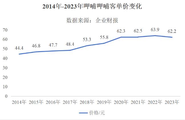 但上市后,呷哺呷哺離初心越來越遠,2014年-2023年,其每年都在提價,客單價由44.4元,升至62.2元,漲幅超過40%。和2011年的35.2元客單價相比,漲幅更是高達76.7%。
