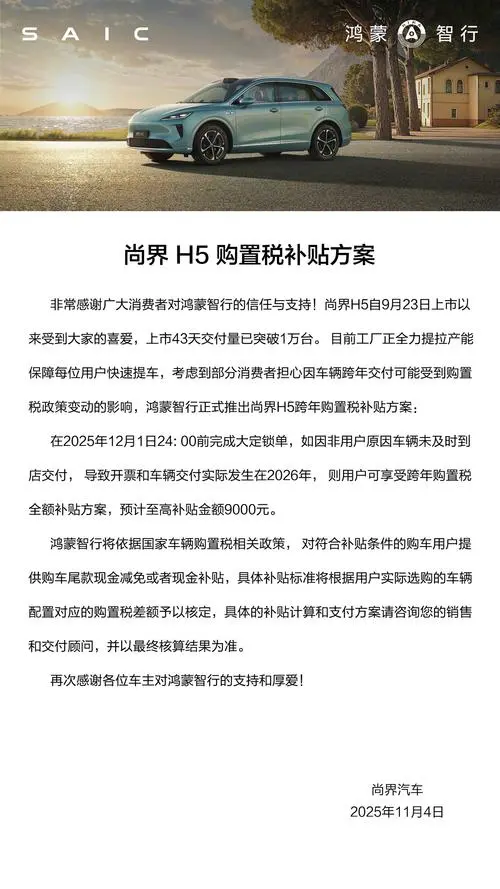 自今年9月23日上市至今,尚界H5在3個(gè)月內(nèi)有關(guān)購車權(quán)益、補(bǔ)貼的價(jià)格政策已經(jīng)完成3次核心調(diào)整,且集中在11月,H5也成為所有鴻蒙“界”字輩車型上市后,價(jià)格政策調(diào)整最快、頻率最高的車型!