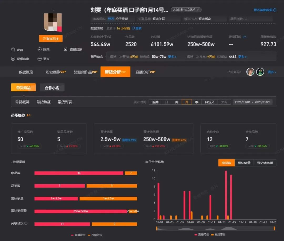 其公開的賬號數據顯示,有超過47萬名消費者通過“劉雯”這一抖音賬號購買了上述產品,其銷售產品的數量則超過58萬件。在快手平臺上,她的賬號總銷量截至1月24日已高達3645.5萬單。她直播帶貨的白酒類產品的銷售額一度高居平臺相應榜單的前幾名。第三方機構的監測數據顯示,“劉雯”僅在抖音平臺過去30日內的直播帶貨銷售額就在250萬元至500萬元之間,這一數據環比上月同期增長了50-60倍,她還會通過修改賬號后綴名稱的方式為一些酒類、食品類品牌代言。