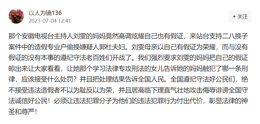 尤其不同的是,“劉雯”是以“嚴肅新聞主播”“匡扶正義”“為民請命”的人設獲得了巨大成功,且以自己的過往官方媒體履歷,甚至是政治身份作為背書,從而籠絡了數量龐大的忠實擁躉,讓她自己事實上已經成為一個群體的代言人,輕而易舉地就可以動員一個群體去攻擊另外一個群體。