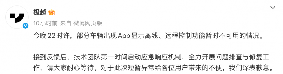 針對此事,極越官方回應稱,接到反饋后,技術團隊第一時間啟動應急響應機制,全力開展問題排查與修復工作,請大家耐心等待。對于此次短暫異常給各位用戶帶來的不便,我們深表歉意。