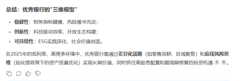 那當(dāng)下,到底什么樣的銀行才能算作一個(gè)好銀行?最近正好是國(guó)內(nèi)上市公司的年報(bào)披露期,我們讓DeepSeek集中對(duì)比來(lái)看看,在數(shù)據(jù)中找到答案。