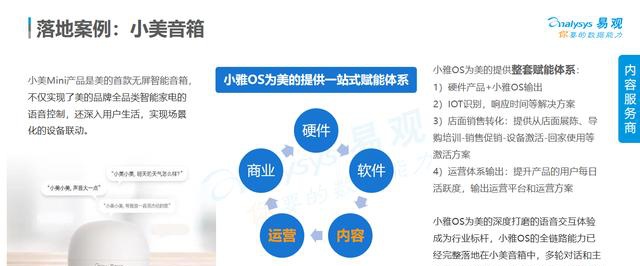 以與美的合作的小美Mini智能音箱為例,小雅OS為美的一站式賦能體系,不僅實現了美的品牌全品類智能家電的語音控制,還深入用戶生活,實現場景化的設備聯動。